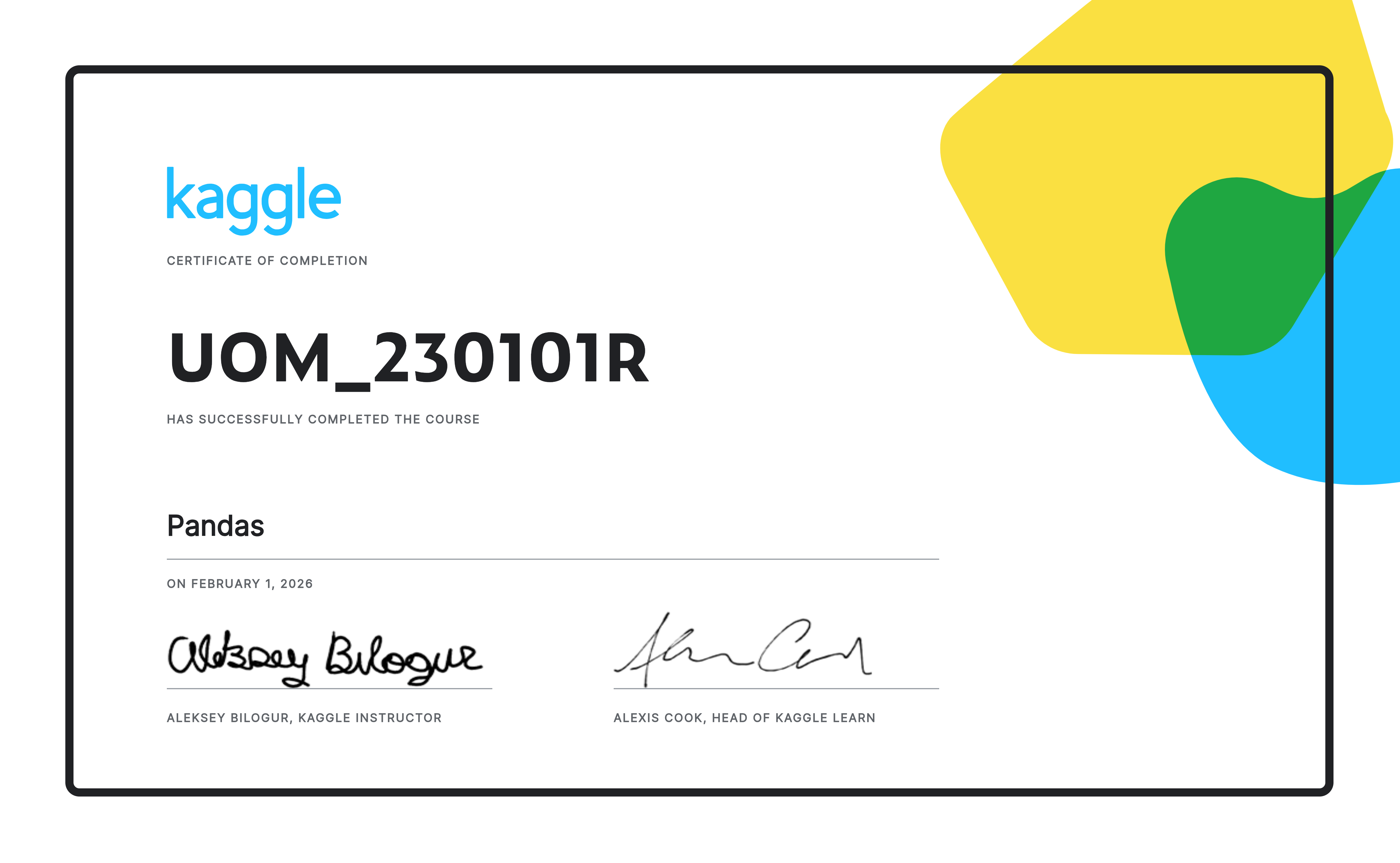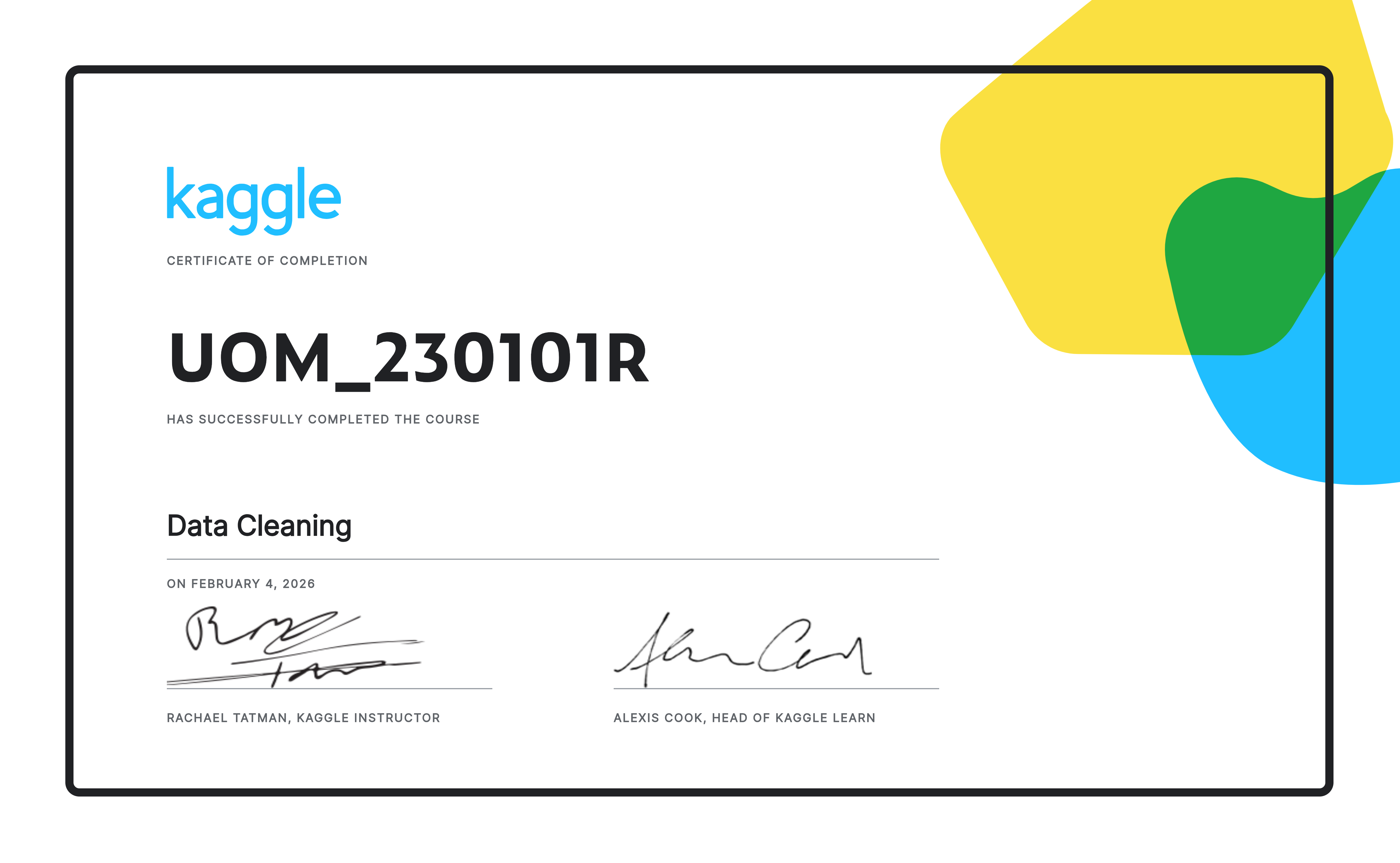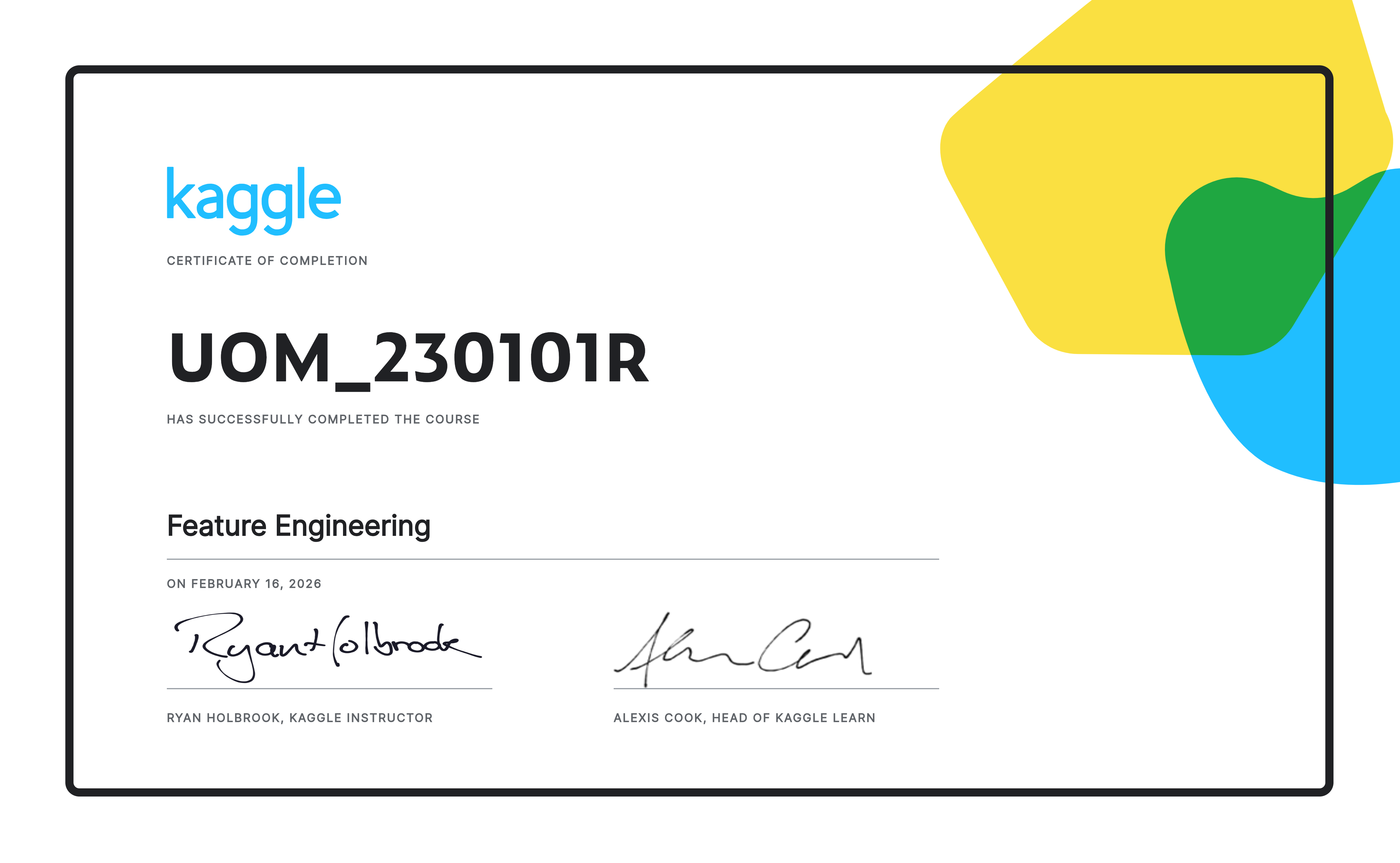 - Feature Engineering — Designing signals to lift model performance; university-issued credential. View ↗